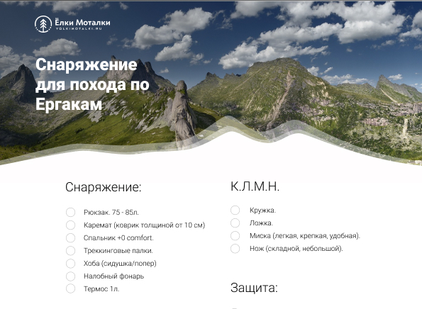 Мы составили список необходимого для похода снаряжения. Но если у вас останутся вопросы - обращайтесь.